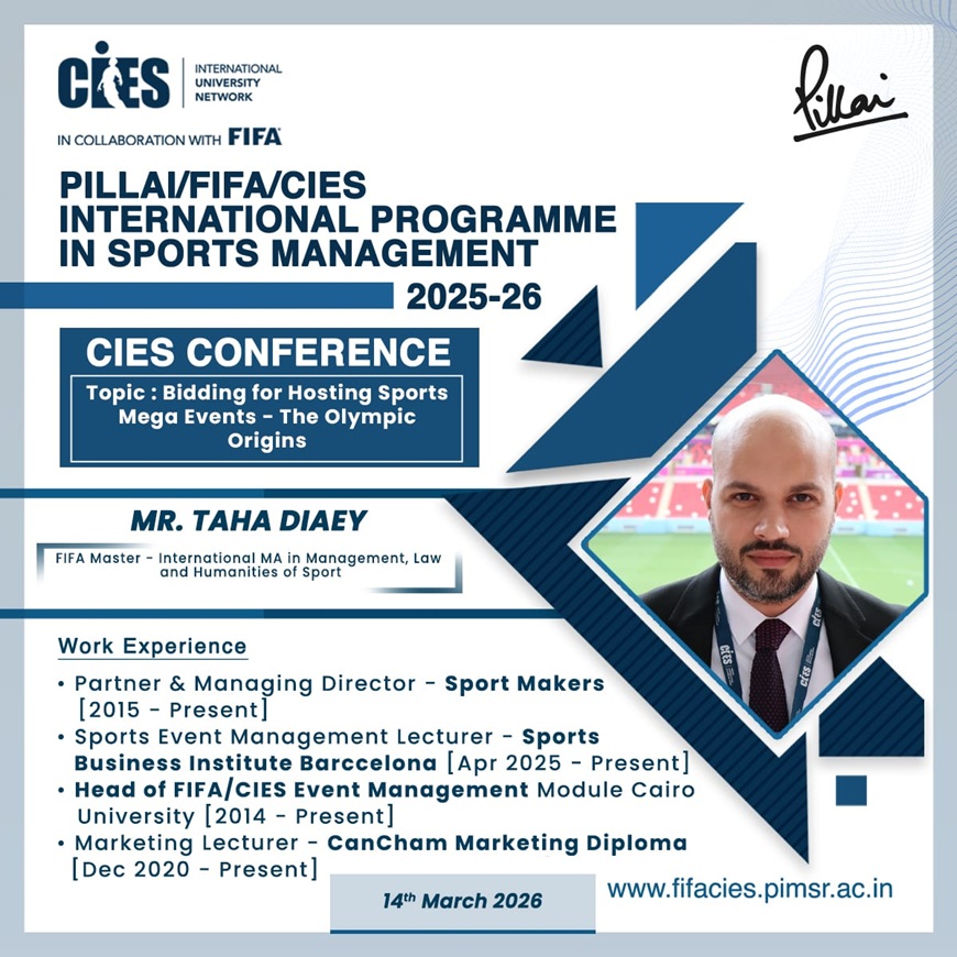 The CIES conference on “Bidding for hosting sports mega events – The Olympic Origins” was conducted by Ms. Mr. Taha Diaey, FIFA Master and Partner & Managing Director – Sport Makers for the participants of the 7th edition of the Sports Management programme on Saturday, 14th March 2026.