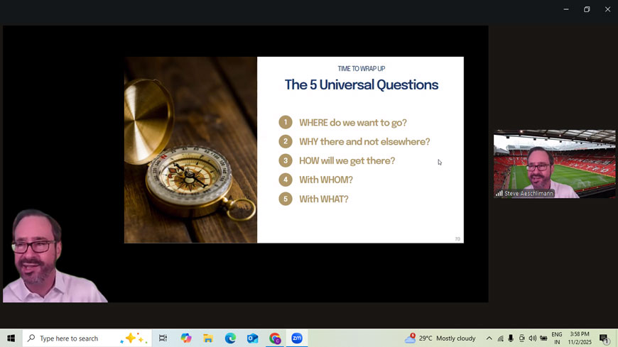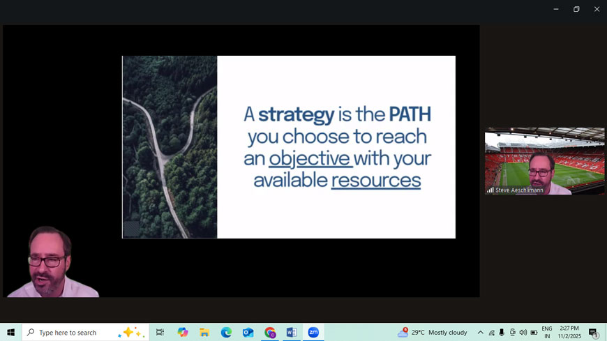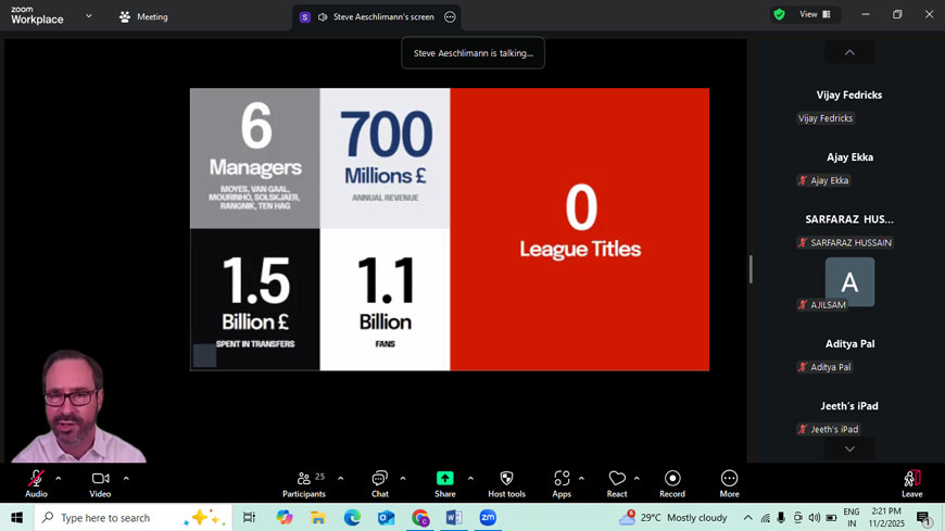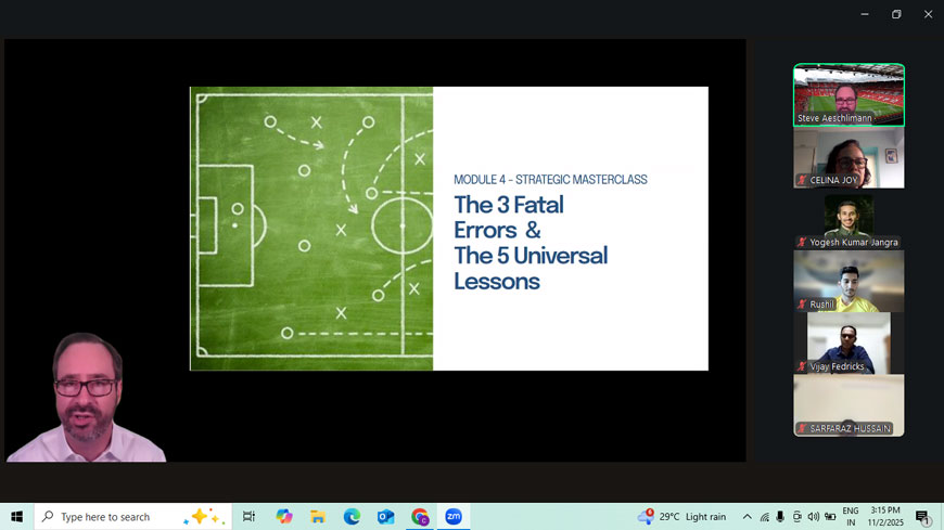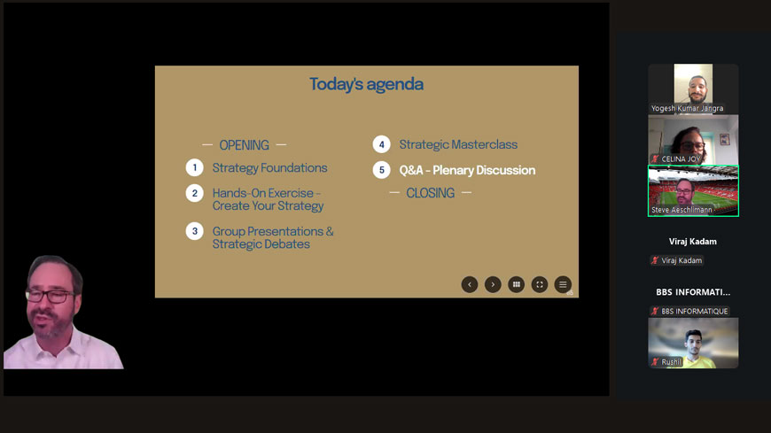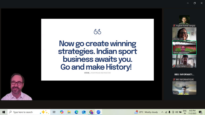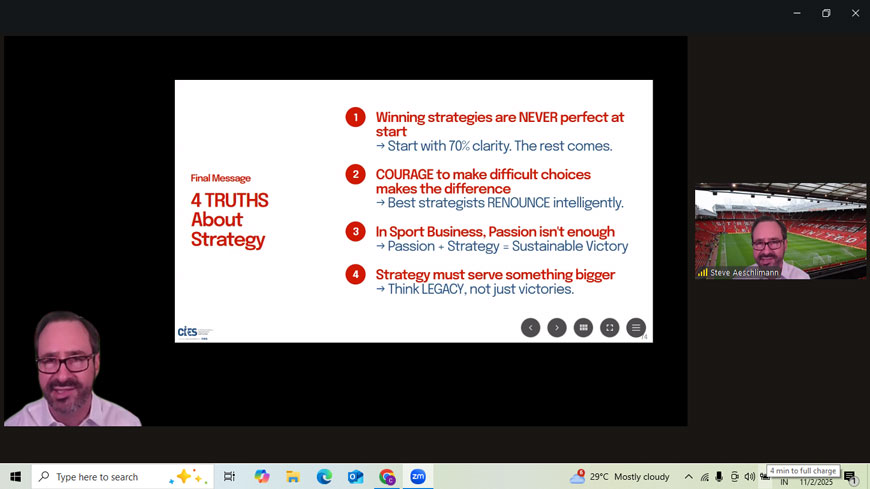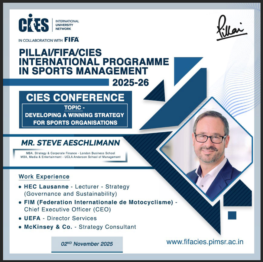 Mr. Steve Aeschlimann was the speaker at the online CIES conference held on 2nd November, 2025 for the 7th edition participants of the PILLAI/FIFA/CIES International Programme in Sports Management. Steve began the conference by giving a brief insight into his journey and varied experiences of delivering lectures on the topic of Strategy. He explained that Strategy is the path you choose to reach an objective with available resources. He shared many successful stories, a vivid example being of an athlete from Kenya who learned javelin techniques by watching YouTube videos. In 2015, he threw 92.72m and won the World Championship. He used whatever resources were available and made consistent efforts with a clear strategy. This shows that strategy is not a wish list or just motivation. Choosing the right path is important. There will be many options in the journey, and a winning strategy is based on key principles of choosing and renouncing. Sometimes we must make difficult choices and stick to the plan until it is achieved.