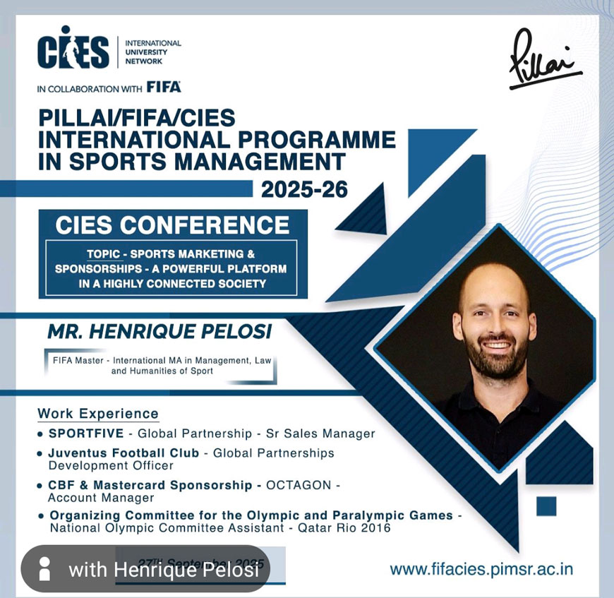 Mr. Henrique Pelosi – Senior Sales Manager at SPORTFIVE delivered an insightful lecture during the CIES Conference on the ” Sports Marketing and Sponsorships – A powerful platform in a highly connected society” for the participants of the 7th edition of the Pillai/FIFA/CIES International Programme in Sports Management on Saturday, 27th September, 2025.
